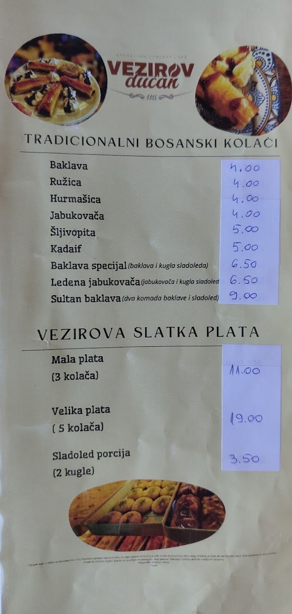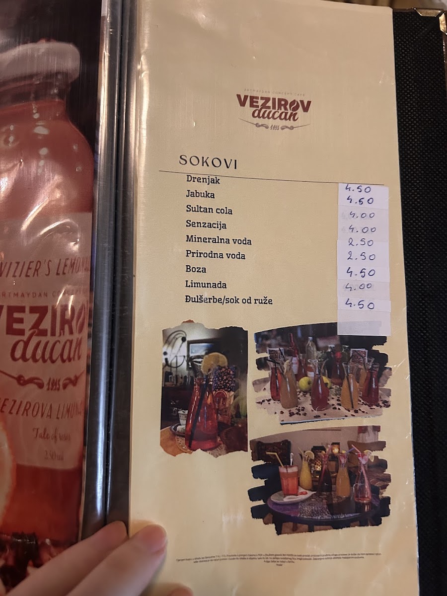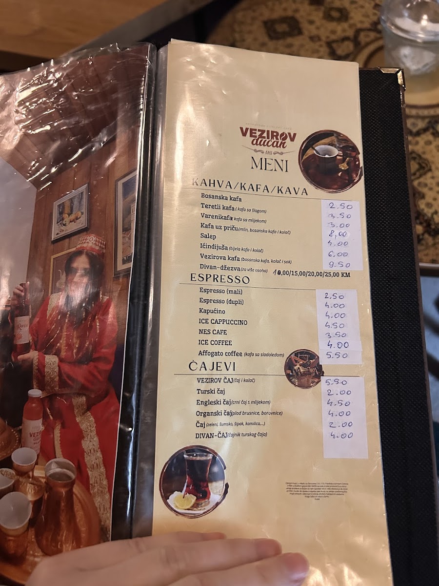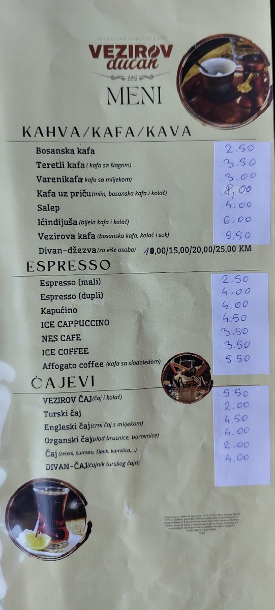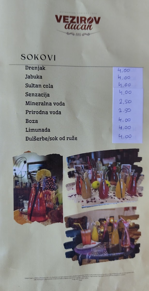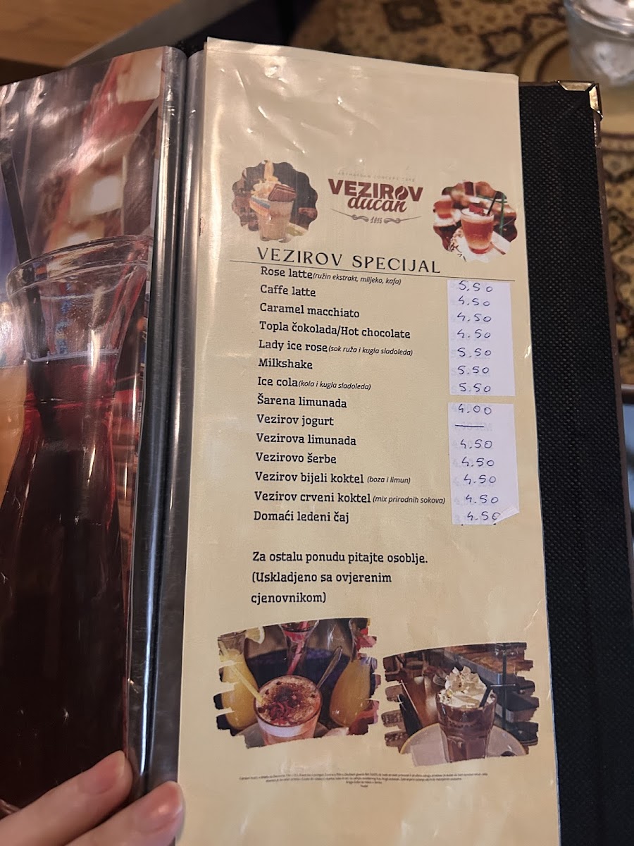 The menu at Vezirov Dućan reflects a thoughtful blend of tradition and gentle creativity, offering drinks that feel both rooted in Bosnian culture and pleasantly distinctive. The Bosnian Coffee and Rose Juice stands out as a memorable pairing, combining the deep, rich character of traditional Bosnian coffee with the light, fragrant sweetness of rose juice, creating a balanced and refreshing experience. Equally charming is the Caffè Latte with Rose Milk, which adds a floral twist to a familiar favorite, resulting in a smooth and aromatic drink that feels both comforting and unique. Another highlight is Vezirova Kafa, a house specialty that captures the essence of local coffee culture, prepared with care and served in a way that invites guests to slow down and enjoy the moment. Overall, the menu may not be extensive, but it is carefully curated, focusing on quality, atmosphere, and distinctive flavors that reflect the spirit of Travnik, making the experience feel authentic, relaxed, and memorable.